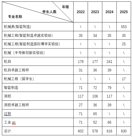 机电学院2022-2025级本科生分年级分专业分布情况