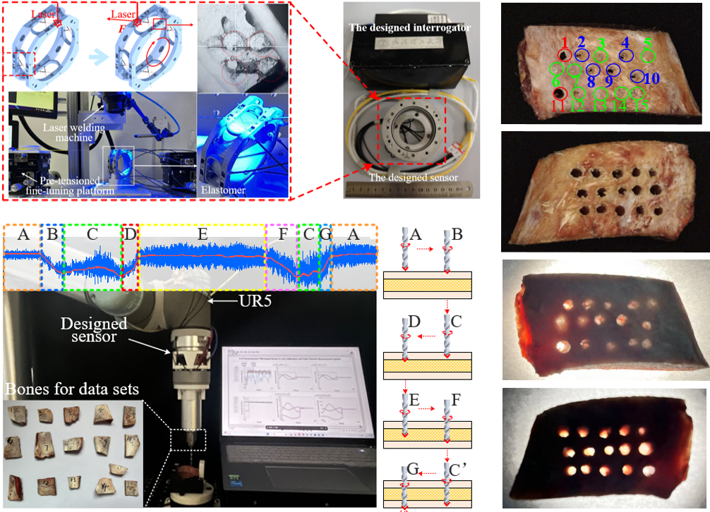 精准感知手术操作力对提高手术机器人操作安全性与精细化水平至关重要。光纤传感器为手术机器人操作力感知提供了一种新手段,但存在光纤光栅热-力串扰、光纤与金属器械胶粘互连临床适应性差,以及临床使役下多维力解耦精度保持难等问题,使其始终尚未走出实验室。因此,李天梁教授课题组通过研究提出了手术机器人阶跃变径光纤光栅六维力/力矩传感器,解决了骨科手术机器人六维力/力矩与温度的高精度同步解耦难题;运用提出的金属化光纤激光熔融固结封装工艺,突破了传统胶粘封装的光纤力感知器械术前热消毒(180℃)耐受性差、易脱粘失效等难题,并将手术操作力高精度(≤5.96%F.S)传感保持能力从短时(传统胶粘封装)提升至半年以上;发明了手术机器人多维力光纤容错解耦测量方法,相比常规无容错的多维力解耦方法,在5%测量精度下对传感光纤断裂容错可校率从零提升至25.7%;依此建立的骨科手术机器人钻孔阶段自识别的智能监测系统,实现了机器人对骨组织自主钻孔操作,为光纤力传感技术临床推广奠定了理论与技术基础。